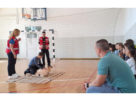 Učenici su zajedno sa nastavnikom fizičkog vaspitanja imali priliku da nauče koliko je važna prva pomoć u sportskim aktivnostima i kako reagovati u određenim situacijama – kako zaustaviti krvarenje, kako pružiti prvu pomoć kod preloma i uganuća, kod povrede glave u sportu i kod naglog srčanog zastoja (mere oživljavanja).