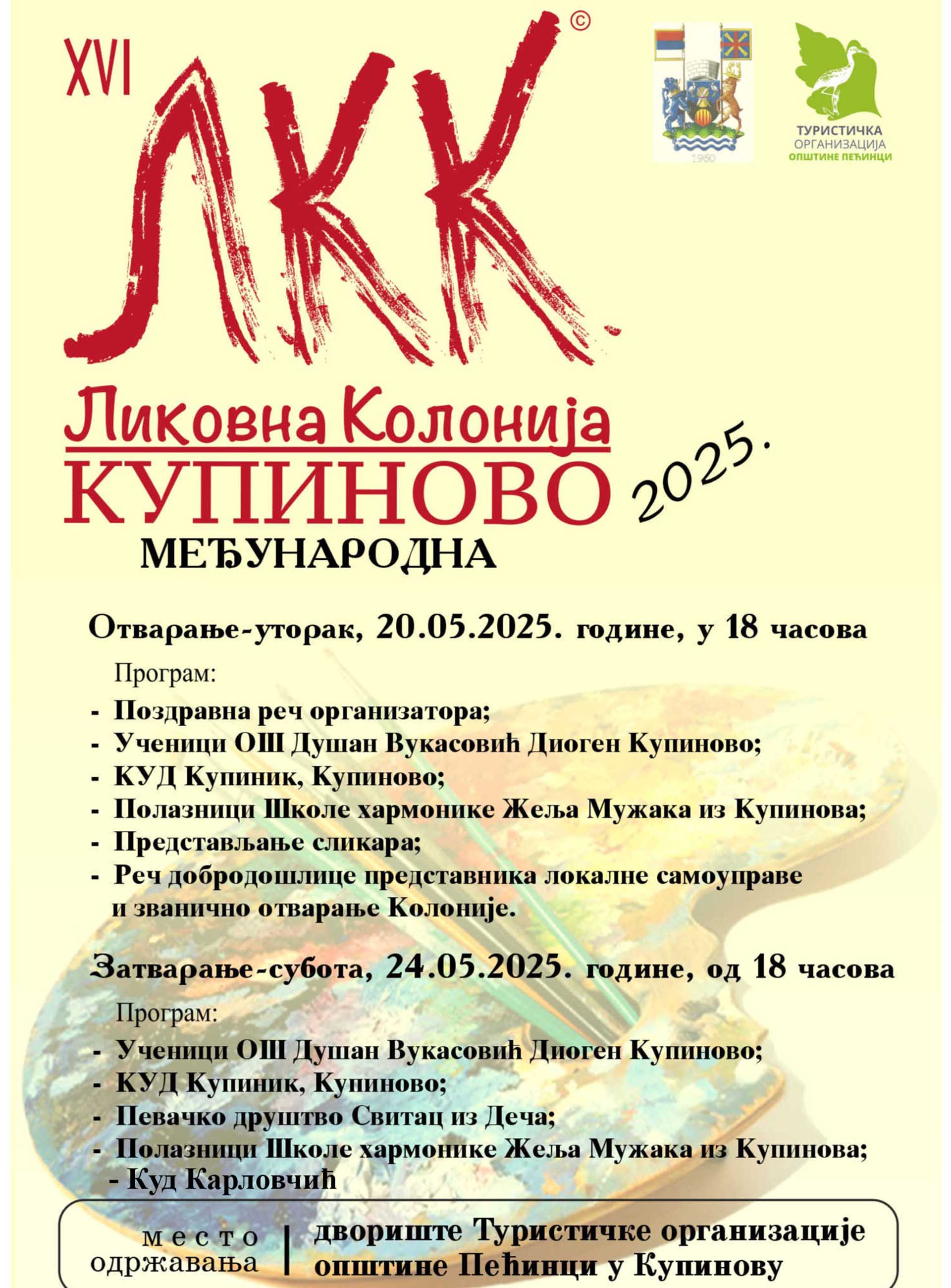Učesnici 16. Kolonije predstaviće se na samom otvaranju, uz prigodan kulturno-umetnički program, a publici će se obratiti i predstavnici Udruženja „Kolonija Kupinovo“ i pećinačke lokalne samouprave.