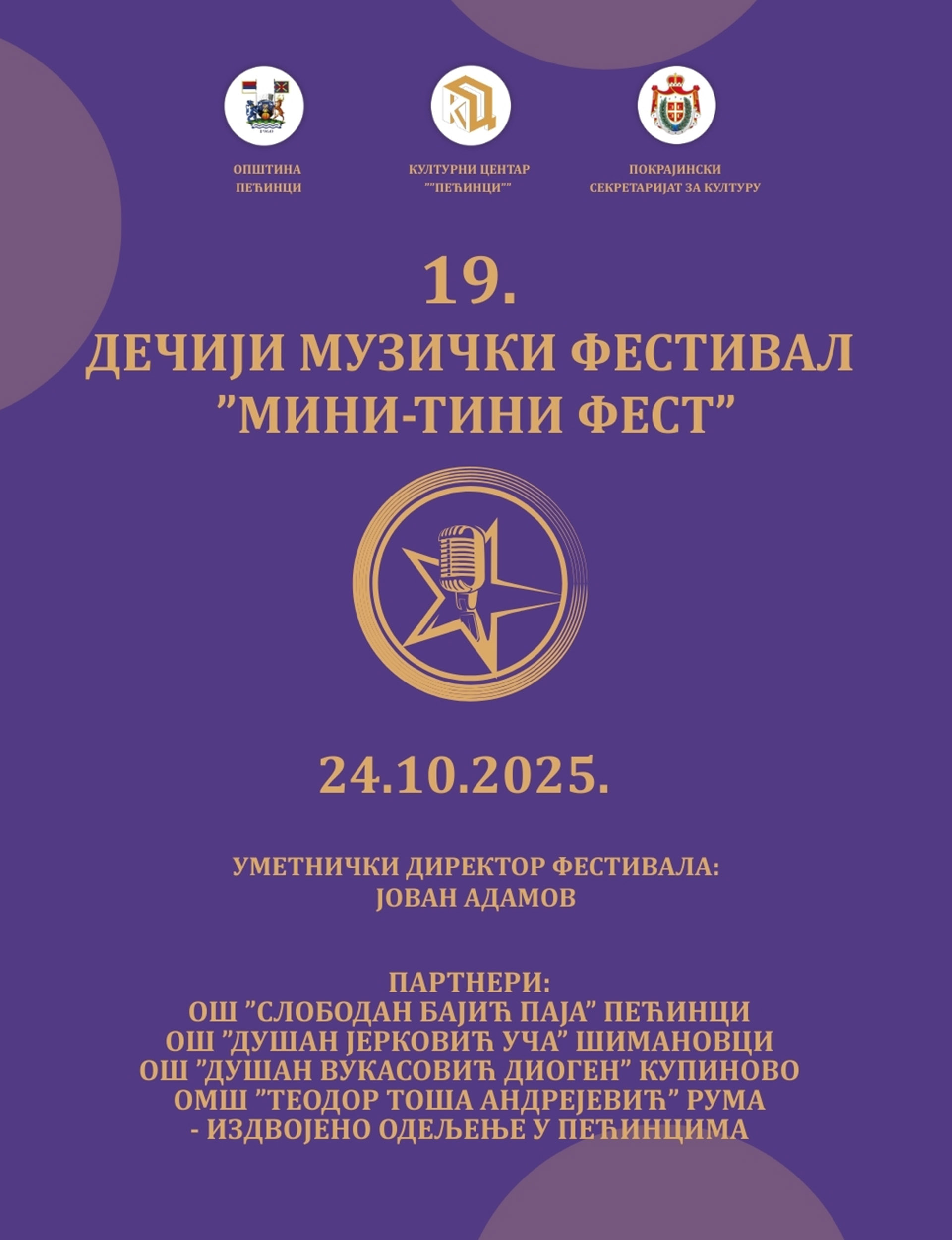 U opštini Pećinci počele su prijave za 19. izdanje dečjeg muzičkog festivala „Mini-tini fest“, koji se ove i godine održava pod sloganom „Deca će pobediti“. Festival organizuje Kulturni centar „Pećinci“ pod pokroviteljstvom pećinačke lokalne samouprave, a završno veče zakazano je za petak, 24. oktobar 2025. godine.