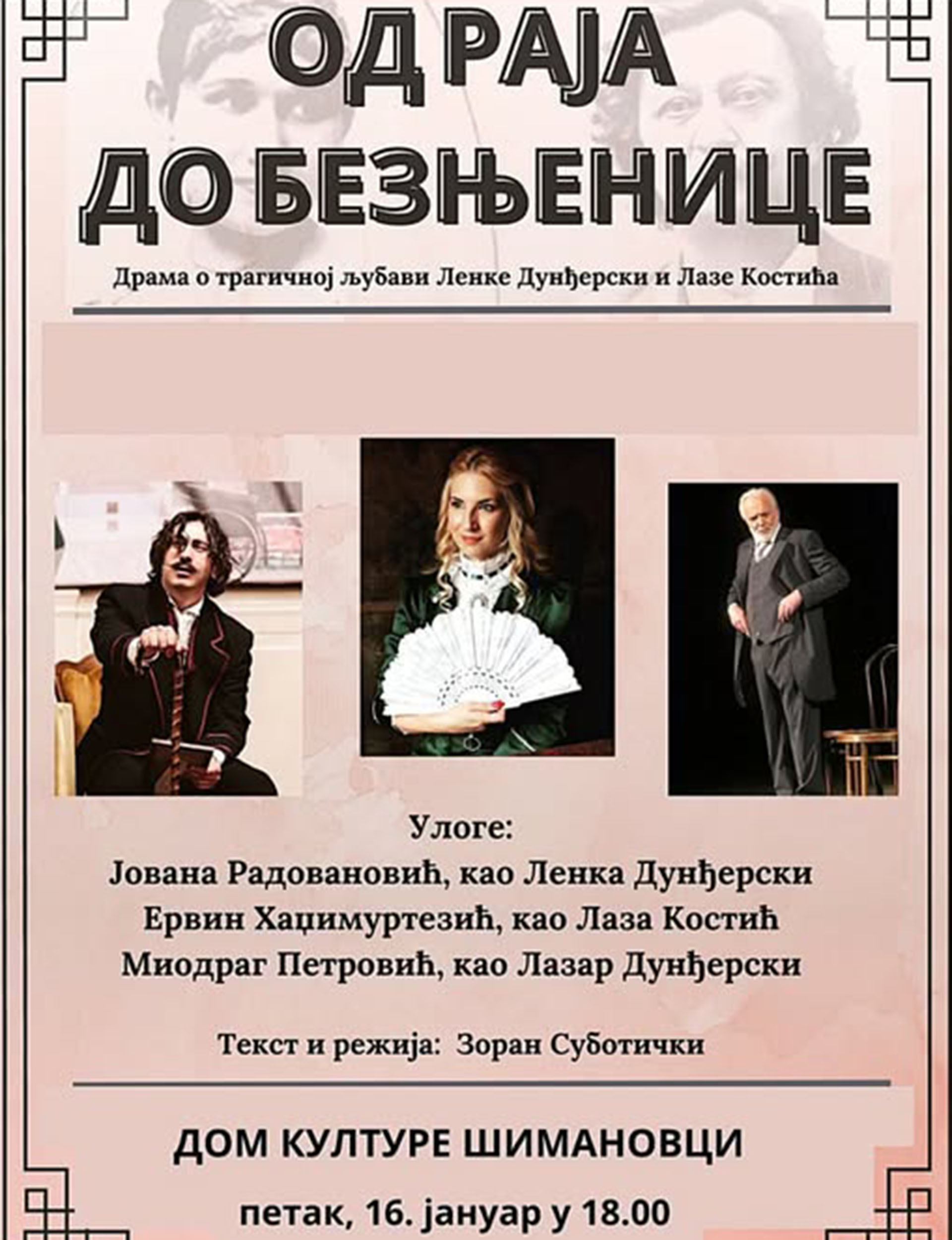 Културни центар „Пећинци“, у сарадњи са Саветом Месне заједнице Шимановци и Удружењем жена „Шимановчанке“, уз подршку генералног покровитеља — Општине Пећинци, најављује извођење драмске представе „Од раја до безњенице“, у режији Зорана Суботичког.