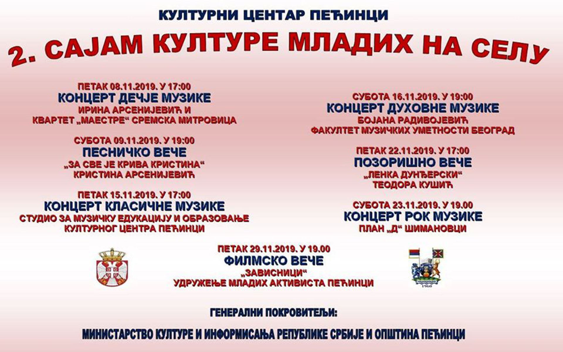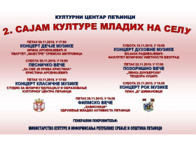 U petak 15. novembra u 17.00 časova pećinačkoj publici predstaviće se učenici Studija za muzičko obrazovaje i edukaciju Kulturnog centra Pećinci u okviru Koncerta klasične muzike, a dan kasnije, u subotu 16. novembra održaće se Koncert duhovne muzike povodom jubileja – 800 godina samostalnosti Srpske pravoslavne crkve, u okviru kojeg će nastupiti studentkinja Fakulteta muzičkih umetnosti u Beogradu Bojana Radivojević iz Brestača sa svojim klasićima, dok će veče biti upotpunjeno besedom koju će govoriti arhijerejski namesnik pećinački jerej Bojan Mijanović.