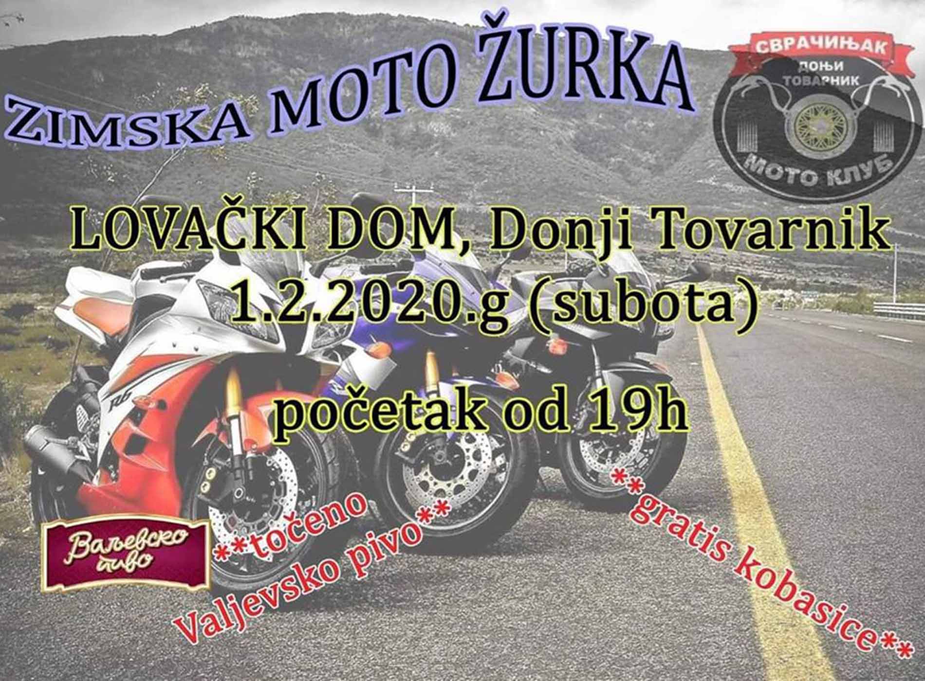 Velika zimska moto žurka počinje večeras, u 19.00 časova, u lovačkom domu u Donjem Tovarniku. Iz Moto kluba „Svračinjak“, koji je organizator skupa, najavljuju odličan provod uz živi nastup „Rajsferšlus benda“. Ulaz je slobodan, a organizatori su za sve posetioce obezbedili besplatnu hranu i piće.