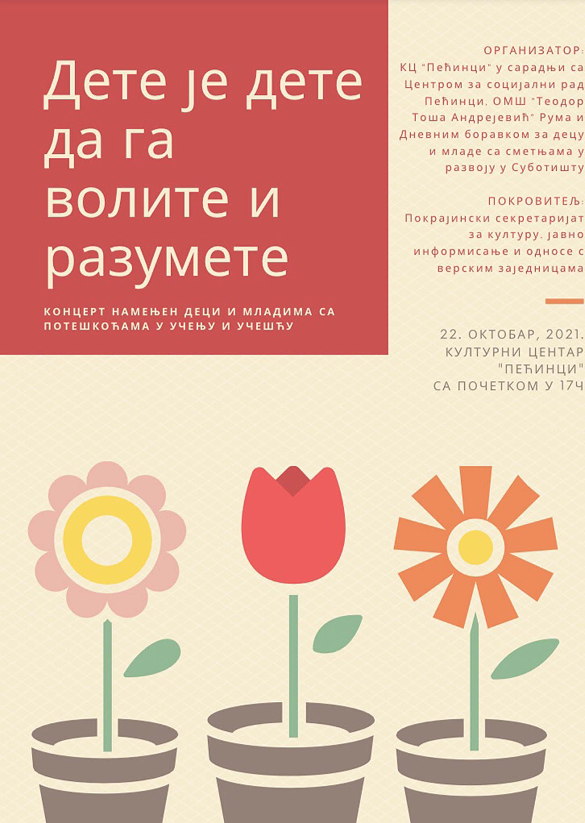 Kulturni centar Pećinci u saradnji sa Osnovnom muzičkom školom „Teodor Toša Andrejević”, organizuje u petak, 22. oktobra, koncerte namenjene deci i mladima sa smetnjama u razvoju, kao osobama iz društveno osetljivih grupa.