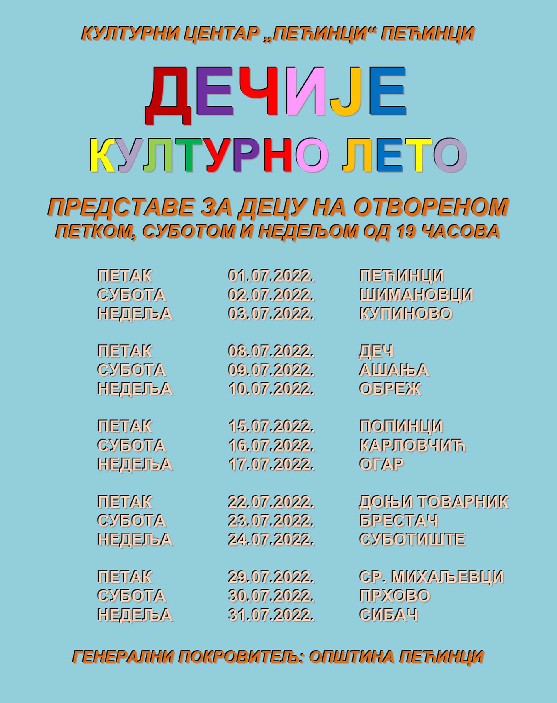 Predstave će se održavati svakog petka, subote i nedelje, na otvorenom, u centrima naselja ili u dvorištima škola, sa početkom u 19.00 časova. Dečje kulturno leto se realizuje u saradnji sa Predškolskom ustanovom „Vlada Obradović Kameni“ u Pećincima, osnovnim školama i mesnim zajednicama.