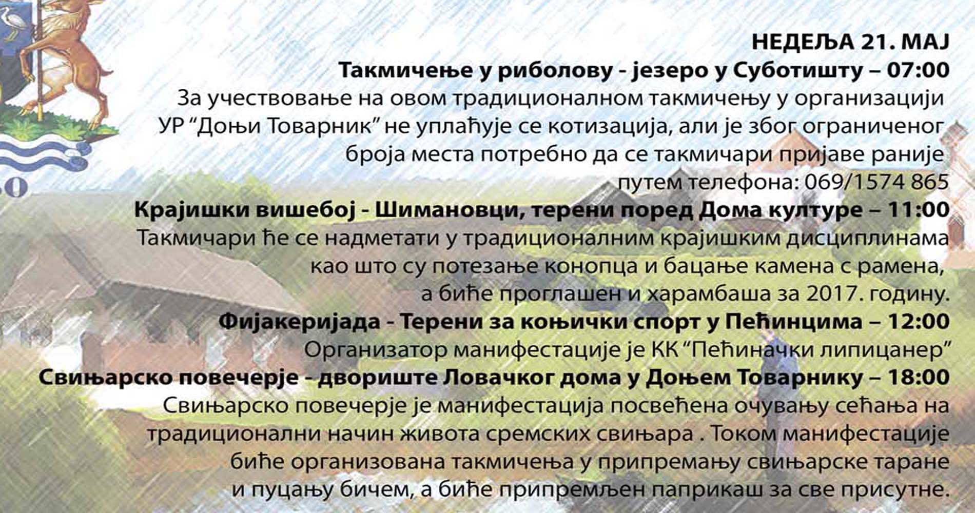 U 11.00 časova u Šimanovcima, na terenu pored šimanovačkog Doma kulture, počinje Krajiški višeboj u organizaciji Udruženja Krajišnika zapadno od Drine, a takmičari će imati priliku da se nadmeću u tradicionalnim krajiškim disciplinama poput kamena s ramena, potezanja konopa, skoka u dalj iz mesta i pretezanja štapa.