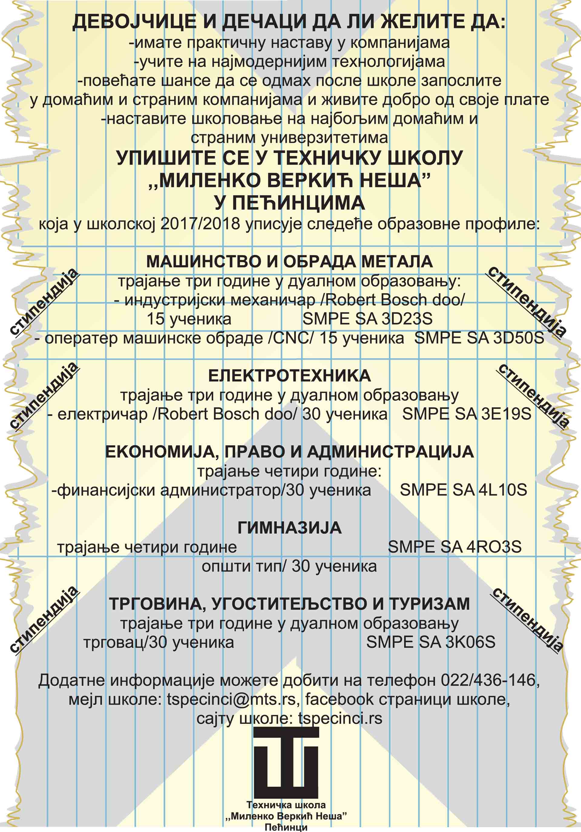 Detaljnije informacije možete pronaći na sajtu Srednje tehničke škole “Milenko Verkić Neša” www.tspecinci.rs.