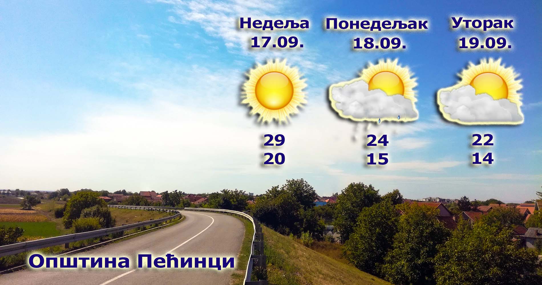 Prema najavama prognostičara Republičkog hidrometeorološkog zavoda Srbije danas i sutra nas očekuje toplo vreme za ovo doba godine. Nakon vedrog i svežeg jutra, temperatura će tokom današnjeg dana dostići 31 stepen, dok se sutra očekuje nešto niža dnevna temperatura uz moguću pojavu kiše. U ponedeljak i utorak dnevna temperatura niža u proseku za 5 do 7 stepeni uz postepeno razvijanje oblačnosti i pojačan vetar.