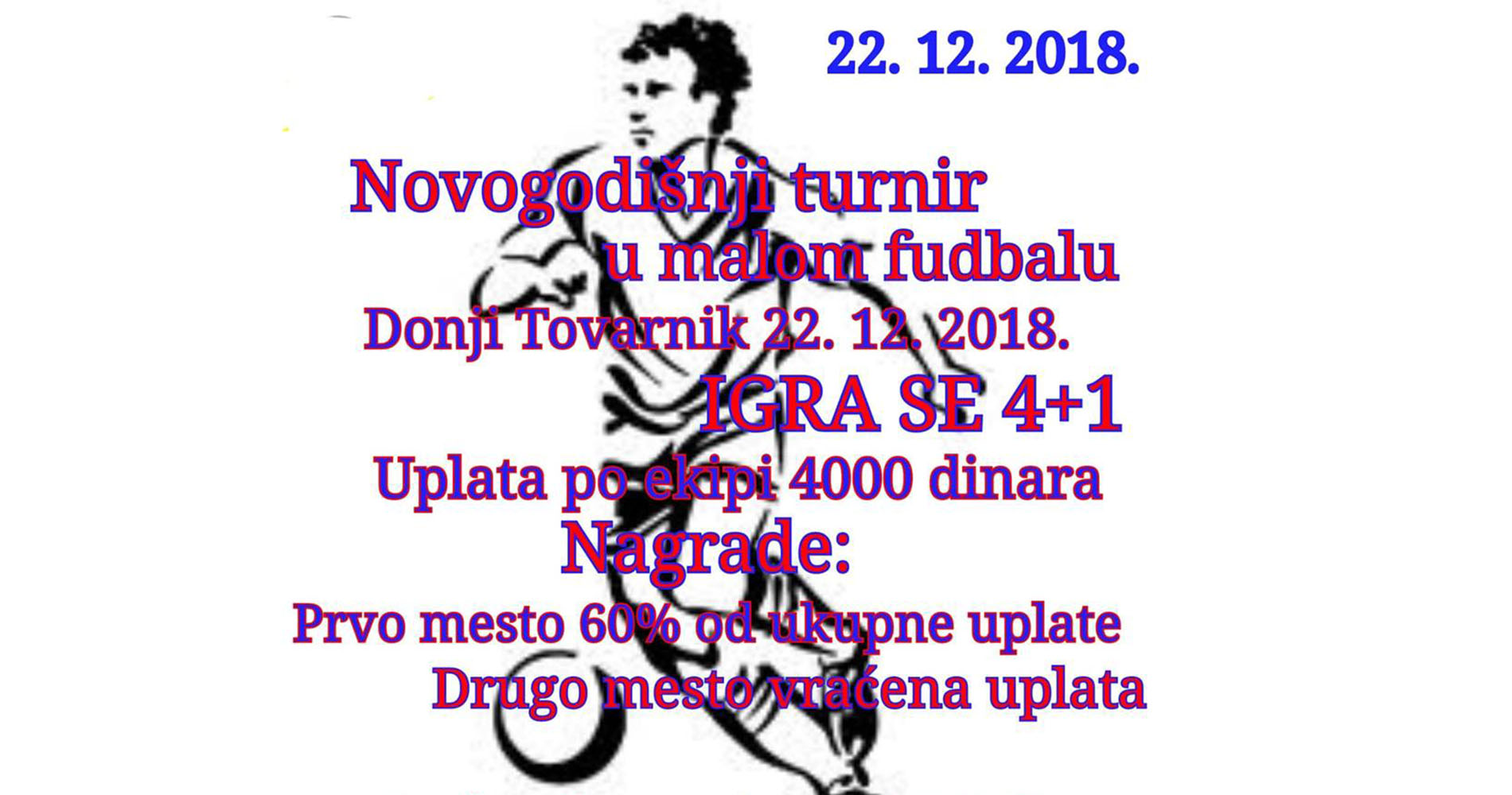 U Sportskoj hali u Donjem Tovarniku biće održan Novogodišnji turnir u malom fudbalu, u subotu, 22. decembra. Igra se 4+1, a uplate po ekipi iznose 4000 dinara. Obezbeđene su novčane nagrade za najuspešnije ekipe. Ekipa koja osvoji prvo mesto biće nagrađena sa 60 odsto od ukupne uplate sa turnira.