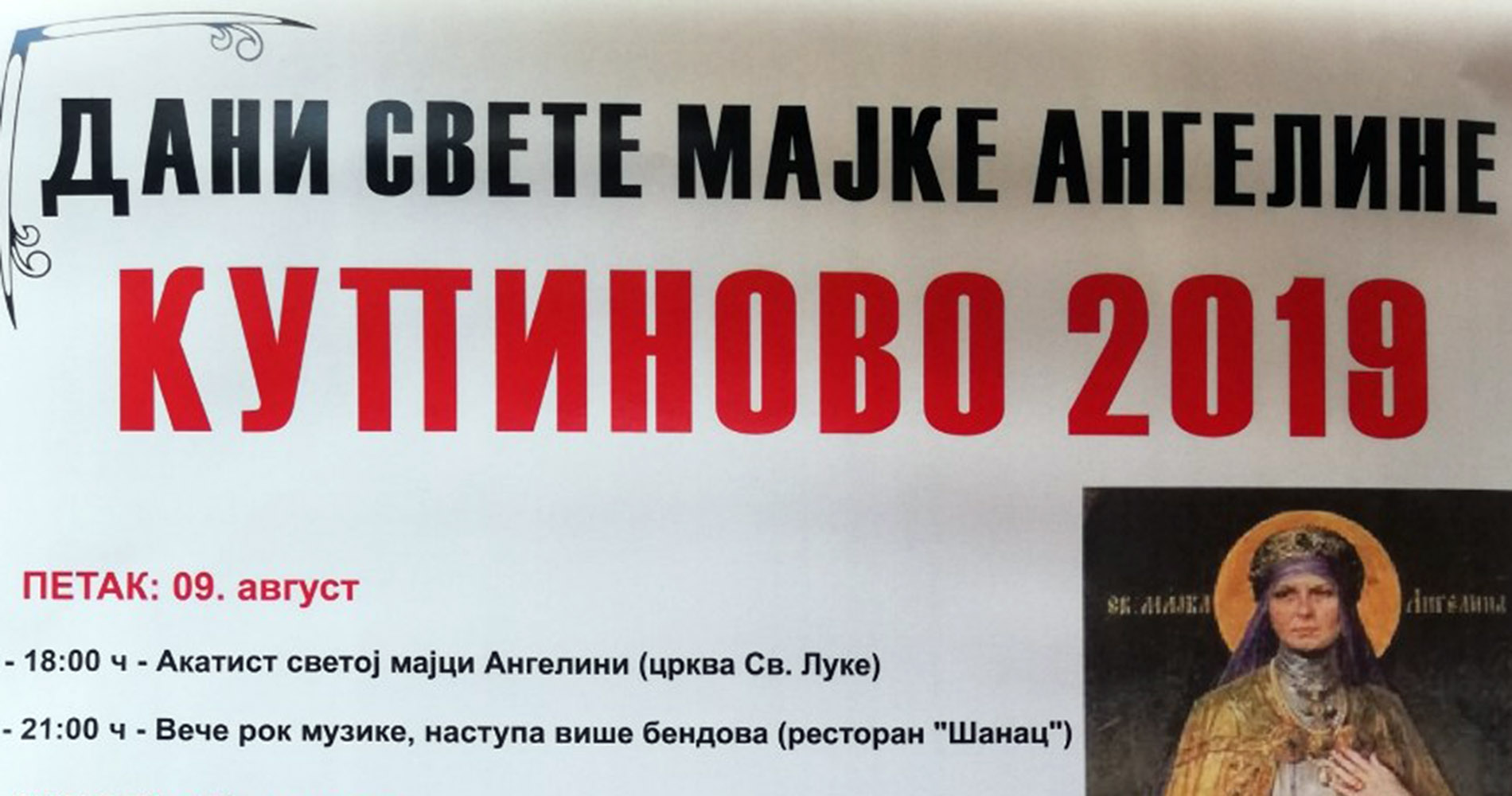 Povodom seoske slave svete majke Angeline u Kupinovu, Savet mesne zajednice ovog naselja u saradnji sa Turističkom organizacijom opštine Pećinci, Kulturnim centrom Pećinci i Srpskom pravoslavnom crkvenom opštinom Kupinovo organizuje niz zanimljivih događaja za Kupince i njihove goste. Program obeležavanja slave počinje večeras u 18.00 časova Akatistom svetoj majci Angelini u crkvi sv. Luke, da bi od 21.00 čas u restoranu Šanac počelo veče rok muzike, tokom koje će nastupiti više bendova.