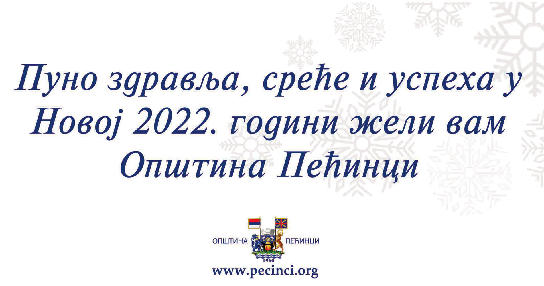 У Новој 2022. години свим грађанима општине Пећинци желим здравља, среће и успеха, слоге и заједништва у породици, и да им Нова година донесе остварење свих стремљења и на породичном и на пословном плану.