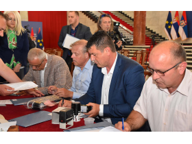 Председник Покрајинске владе Игор Мировић уручио је јуче 45 уговора представницима 31 локалне самоуправе о суфинансирању изградње, санације, реконструкције и израде техничке документације водних објеката у јавној својини и објеката фекалне канализације, и за суфинансирање уређења атарских путева и отресишта на територији АП Војводине у 2022. години.