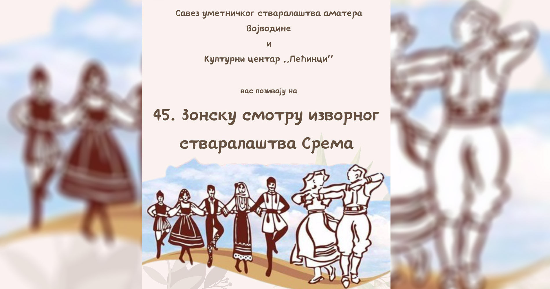 Зонска смотра фолклорних традиција Срема биће ове године одржана 45. пут у суботу, 8. јуна, од 18.00 часова, у Културном центру Пећинци.