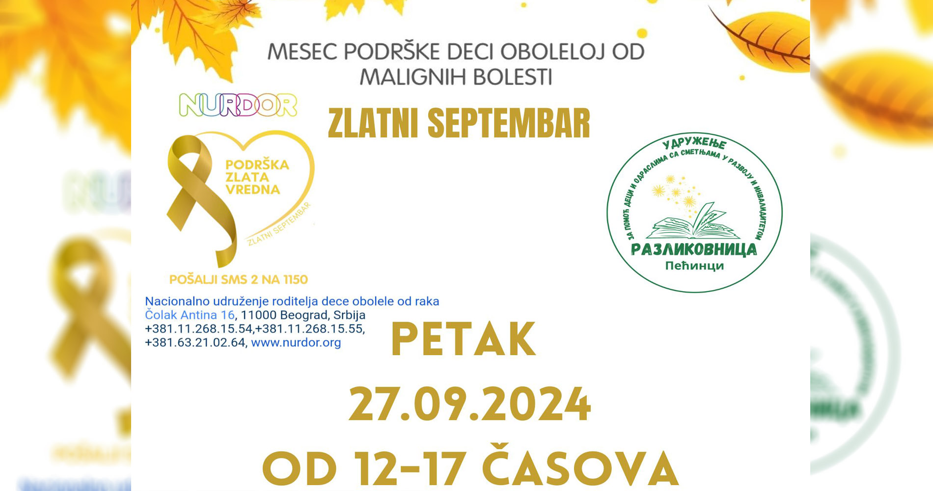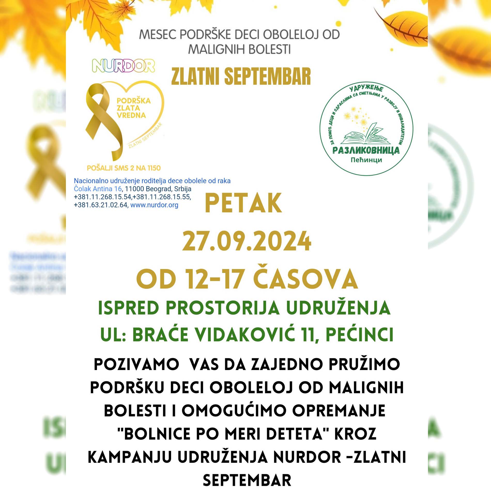 Удружење за помоћ деци и одраслима са сметњама у развоју и инвалидитетом “Разликовница” из Пећинаца прикључило се, као волонтер/координатор, акцији Удружења НУРДОР у кампањи подршке деци оболелој од малигних болести под називом "Златни септембар".