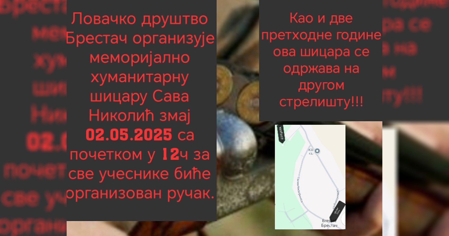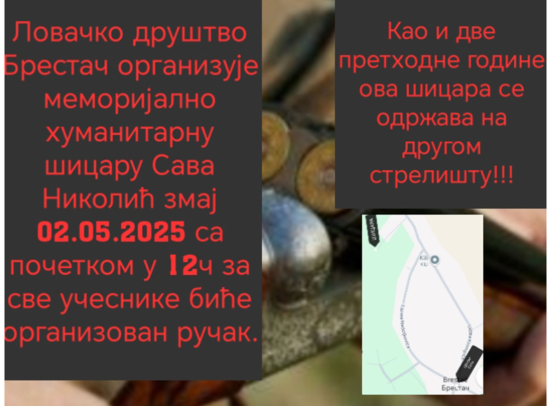 Шицара почиње у 12.00 часова, на новом стрелишту на крају крака Челикове улице у Брестачу (на путу према Никинцима, последња улица лево, а биће постављени и путокази). Стрелци ће имати прилику да се опробају у класичној шицари и у дисциплини трап (гађању глинених голубова). За победнике су припремљени пехари, а за све учеснике биће организован ручак.