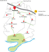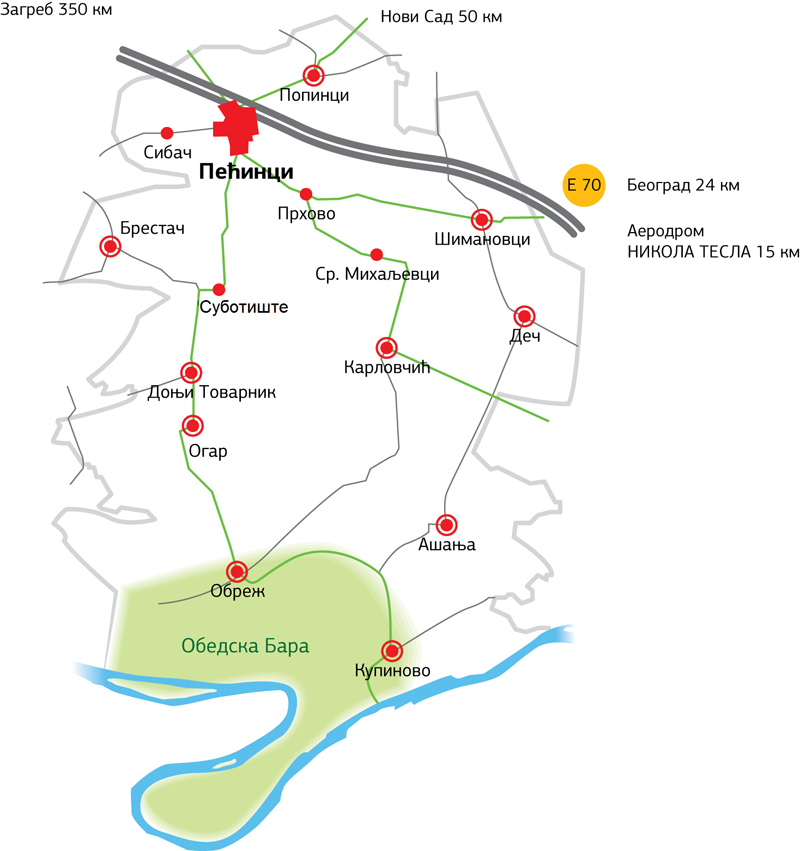 Pećinci Municipality is surrounded with six urban areas - Belgrade, Zemun, Stara Pazova, Ruma, Sremska Mitrovica, Šabac and Obrenovac. Although some villages tend to rely on neighboring towns, gravity to Belgrade is, however, dominant.